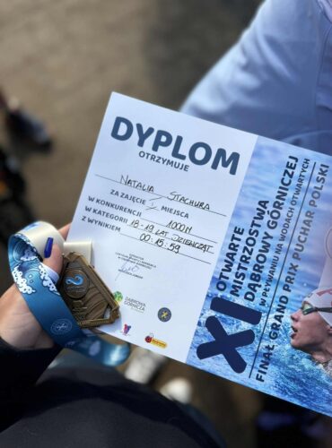 Natalia Stachura złotą medalistką w pływaniu. Opublikowano 5 września 2025 Podczas Grand Prix Puchar Polski na wodach otwartych w Dąbrowie Górniczej w dniu 31.08.2025 Natalia Stachura zdobyła złoty medal na dystansie 1km w kategorii wiekowej 18-19 lat.