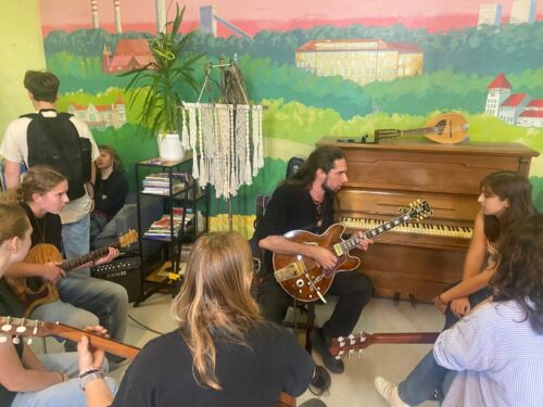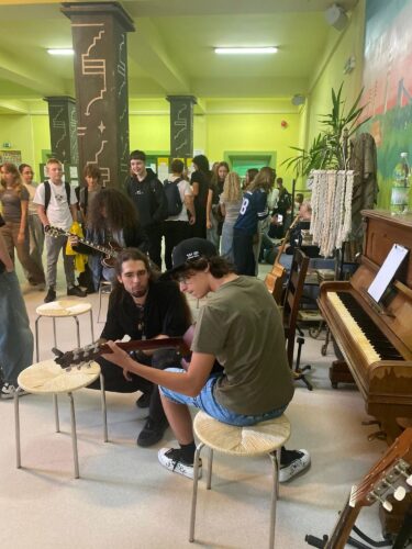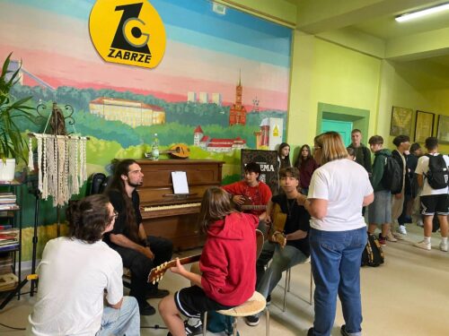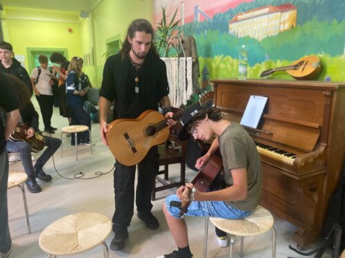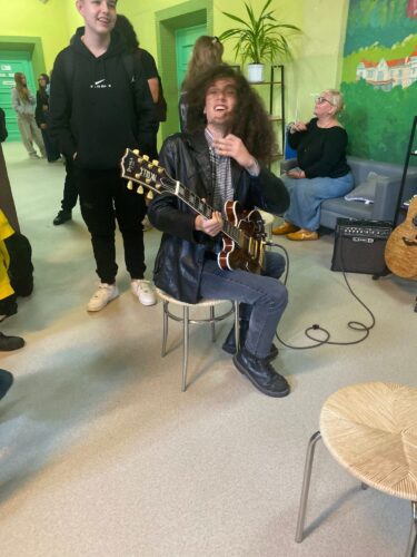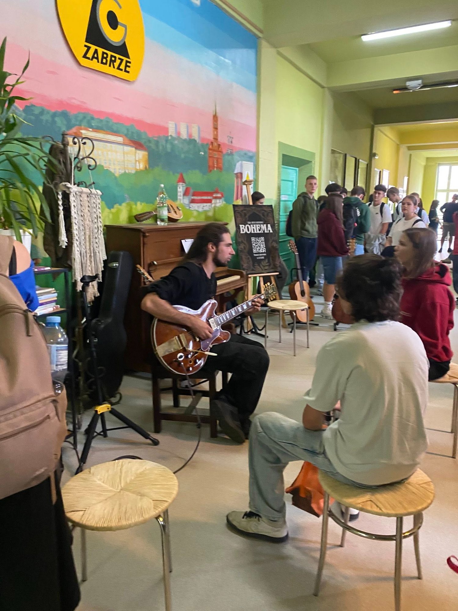 Odwiedził nas absolwent, Sebastian, który otworzył swoją szkołę muzyki rozrywkowej „Bohema” i w trakcie przerw prowadził warsztaty gitarowe dla naszych uczniów i naszych uczennic.
